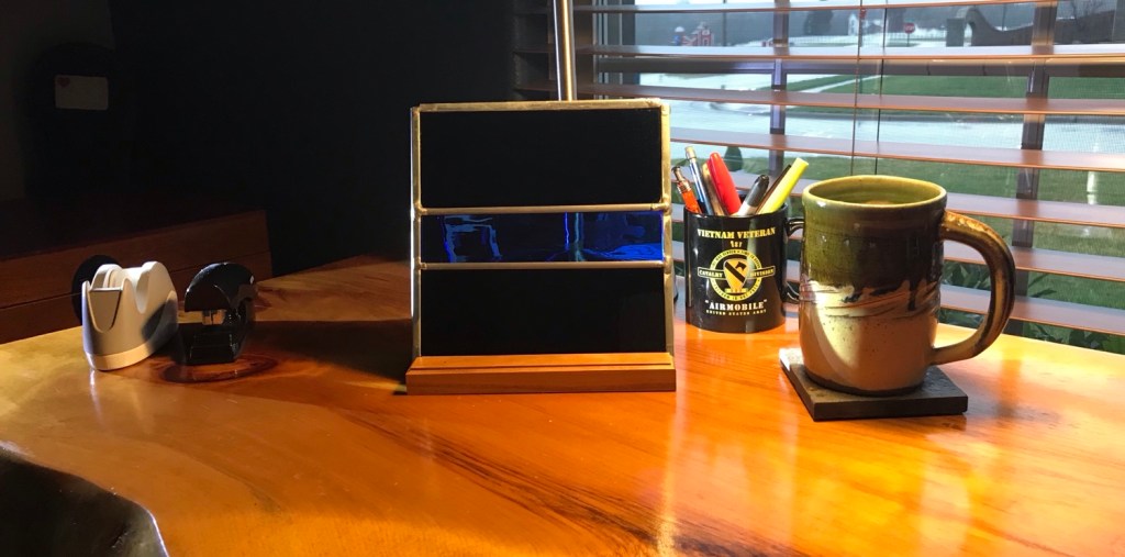 The hand crafted, stained glass, blue line plate in the photograph was given to me by a terrific, civilian employee of the Patrol, Jennifer Wease, several years after retirement. It sits on my desk and is a constant reminder of the years spent in perpetuating this honorable profession. I am in no hurry to make my exit, but when I do, this plate will be nearby as folks take the time to either curse my existence or praise my efforts. Make no mistake, though, the blue line is deeply imbedded and I will never turn my back on the men and women who are charged with the separation of the abhorrent from the mundane.