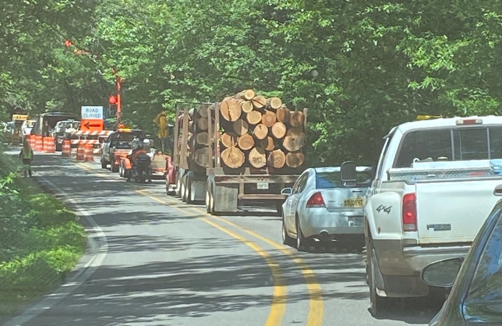 Finally, the ultimate adventure. I have always wanted to ride the infamous Pig Trail through the Boston Mountains of Arkansas on my motorcycle. Having not accomplished this, I made the decision to pull our 34’ RV down the trail. It is a series of sharp switch backs and challenging hills and grades. When we entered we were greeted by a “road work ahead” sign, prompting some concern, but I am a “professional driver” so ahead we charged. There is no turning around when you are well into the trail. Some 15 miles in we encountered a sign that said no trailers over 16’ allowed. It was a sphincter tightening moment. The sign needed to be 15 miles back from where it was erected. We soon drove up on a line of stopped traffic, including a loaded log truck pulling a “pup” or trailer also loaded with giant oak timber. We could see a problem on the hairpin curve ahead and a group of highwaymen talking to the truck driver. They left him and came to talk to me. They explained that a one lane, inside section of the curve had fallen away in two places and that I could not make the curve. The boss noticed Sharon’s police pillow and asked if I was a LEO. Turns out he was a deputy before retiring and going into road construction. I asked if I could walk down and look at the problem and he invited me to do so.