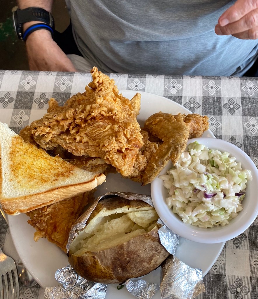 Back to this cafe. I noted on Trip Advisor, after we returned home, that a number of folks recoiled at the idea of waiting for honest to goodness pan fried chicken. Sorry, this isn’t the simulated chicken parts you get in a box. Sharon loves gizzards and livers and the platter, too hot to touch, of these delectables was piled 4 inches high, with all the afore mentioned sides. A chicken dinner is four pieces, any combination, from all white to all dark and go boxes are an absolute necessity. They have all you can eat cat fish and the pies had meringue piled high. Pie not your thing, finish with a cup of soft serve, vanilla or chocolate or both. Read this sentence carefully, without pie, our total check was 21.73, with ice cream. Yes, two beautiful pan fried chicken dinners and soft drinks for a 20 spot and change. To be honest, I don’t know what else is on the menu….my cap was set coming in the door when I saw the chicken coming out of the kitchen.