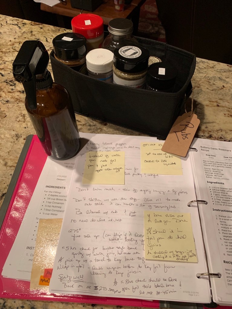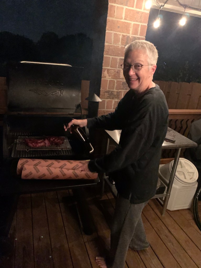 Sharon has developed quite a set of notes relative to the preparation of meat on a smoker. She reads voraciously on the topic, borrowing technique and recipes from the great Texas and Alabama smoke artists. She is developing a style unique to our tastes, eschewing the traditional spices with modifications that suit us, taking the spice induced heat out of the meat to protect old stomachs that can no longer endure a ghost pepper finish. Among her late mother’s coveted old cook books, she treasures her developing manuscript on the art of smoking above all else in the kitchen. She is a Traeger Wizard, although concedes the name on the smoker means little if you are just going to throw it in and jerk it back out with a slathering of some preservative laden sugar free stuff that is designed to insulate the diner from a piece of dry, flavorless muscle that would send Tazzy to the kibble can.