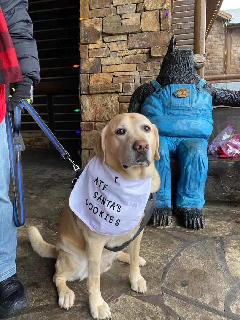 So, was I successful? I think so, but was not privilege to the final tally. People displayed a lot of Christmas spirit and were very upbeat. My efforts were enhanced by Tazzy, wearing an apron that read “I Ate Santa’s Cookies”, sitting by the kettle, and a smiling Sharon on the Bear Bench behind my duty post, throwing out a final Merry Christmas to the folks we met. A confession is in order. I am absolutely confident that whatever money we raised broke along two lines. I may have accounted for 30% of the take, Tazzy earned the rest. Bring a cute dog to your next fund raising effort. They are money in the bank. Too bad Lee Iacocca never thought of this…..thank you Tazzy, and to the Salvation Army for the opportunity to make a difference.