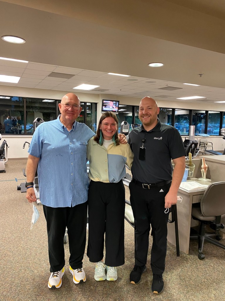 This has been a long process. In early April, I fell down the steps into our garage. On May 5, the talented Dr. Timothy Galbreath, an orthopedic surgeon in Jefferson City, reconstructed a badly messed up shoulder. He is in favor of limited immobilization post surgery, unlike many surgeons, and prescribed physical therapy beginning on May 17. I elected to rely on the Physical Therapy services at Mercy Hospital and was introduced to Coe Rose, PT DPT, shortly after. Coe and I share a propensity for very short hair (none) and began a protracted relationship involving a manageable level of pain and plenty of homework. Along the way, a young lady, Katelyn Schmude, a senior student of Physical Therapy entered the picture. Katelyn is finishing a PT internship under the watchful eye of Coe before returning to school in St. Louis. Simply put, I could not have been in better hands.
