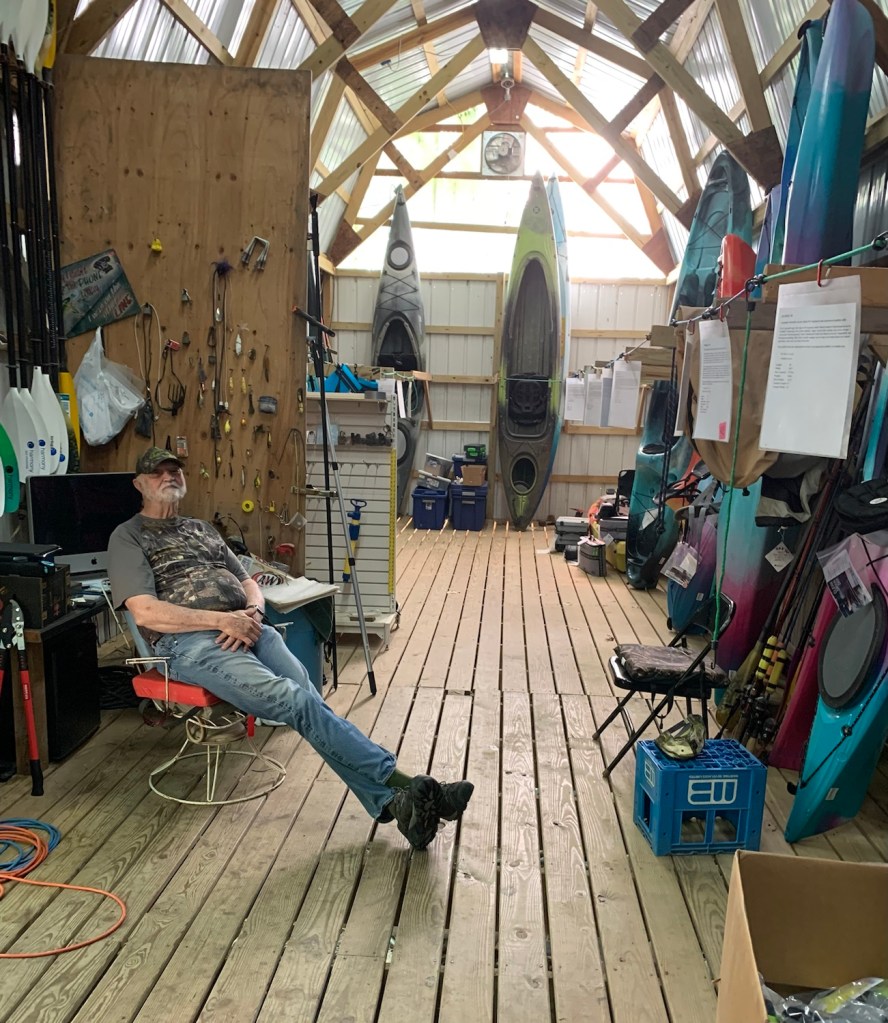 Jim looks like he sounds. A camo hat perched over his ready smile and Ozark drawl make you want to pour a jigger of good bourbon and listen closely as he pontificates on the merits of his favorite small mouth baits. (Hint: Jim loves top water lures.) He keeps what appears to be a hundred or so kayaks at his warehouse and a good selection in his shop, which in high water may see as much as 5’ of Niangua running through it. No problem, though, he designed his building with flood water in mind. Jim handles his customers one or two at a time and by appointment only as business isn’t allowed to interfere with river time and life in the slow lane. I say that with tongue in cheek as Jim finds time to sell well north of 300 kayaks a year. Jim loves what he does and does what he loves well.